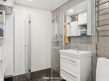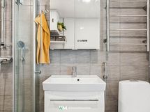 - suihku, taittuvat suihkuseinät, wc-istuin, bide-suihku, lavuaari, allaslaatikosto, peilikaappi, pyyhekuivain, kaapisto, pyykinpesukoneliitäntä, lattialämmitys.