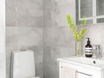 Lattia laatoitettu ja seinät kaakeloitu.