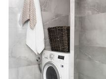 Pesuhuoneesta käynti vaatehuoneeseen. Mittatilauksena tehty peiliovi. Erillisen WC:n kuvaus: Peilikaappi, allaslaatikosto, wc-istuin, bidee-suihku, pesukoneliitäntä (paikka myös kuivausrummulle).