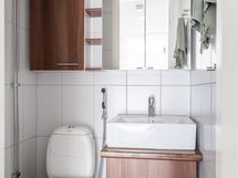 - Suihku, suihkuseinä, pesukoneliitäntä, pyyhekuivain, kaapistot ja jaloilla seisova taso. Paikka sekä pyykinpesukoneelle että kuivausrummulle. WC: WC-istuin, lavuaari, allaskaappi, peilikaappi