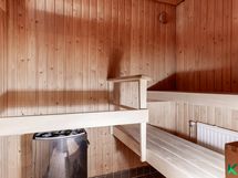 - Sähkökiuas, saunan lauteet. Saunasta myös kulku terassille. Seinämateriaali: paneeliseinä. Lattiamateriaali: laattalattia