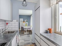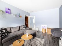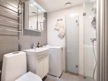 - Pesutilojen varusteet: WC-istuin, suihkuseinä, pesukoneliitäntä, lattialämmitys, peilikaappi, allaskaappi ja seinäpatteri.
