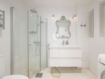 - Pesutilojen kuvaus: Kaunis kylpyhuone, jonka tunnelmaa korostavat viehättävät pikkuikkunat. Lattia vaaleasävyistä kuvioitua laattaa, seinät valkoista kaakelia. Varustus: WC-istuin, pesuallas, allaslaatikosto, peili, kokoontaittuva suihkunurkkaus, pesukoneliitäntä, pesukone, pyyhekuivain. Kylpyhuoneessa on lattialämmitys.