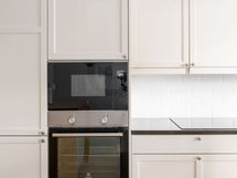 - Viihtyisä keittiö, jossa hyvin sekä kaappi- että työ- ja laskutilaa. Keittiöön mahtuu isokin ruokapöytä. Keittiön kaapistot ovat vaaleat. Työtasot ovat kiveä. Varustus: induktioliesitaso, integroitu erillisuuni (Electrolux), integroitu mikroaaltouuni (Electrolux), integroitu astianpesukone ja jääkaappipakastin. Lattia parkettia, seinät maalattu/lasikuitutapetti, välitila valkoista kaakelia.