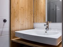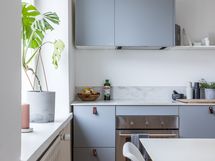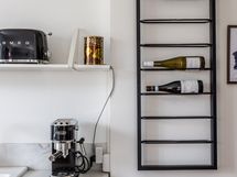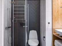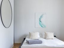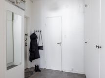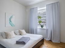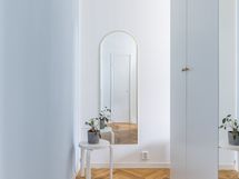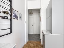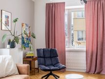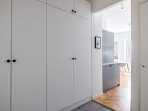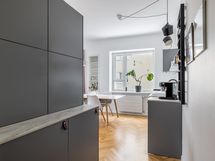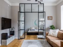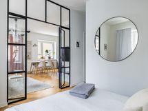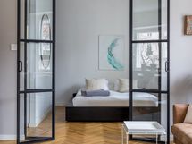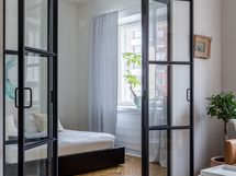 Makuuhuone on erotettu olohuoneesta näyttävillä lasipariovilla, joka luo samalla tilan tuntua. Uudistuksen yhteydessä asuntoon on saatu runsaasti säilytystilaa. Eteiseen on mittatilaustyönä teetetty kaapistot ja makuuhuoneesta löytyy myös lähes koko seinän levyinen, kattoon ulottuvat vaatekaapistot. Kylpyhuoneen ilmetttä on ehostettu tyylikkäillä laatoilla ja mikrosementtipinnoitteella. Tilaan mahtuu myös pyykinpesukone.