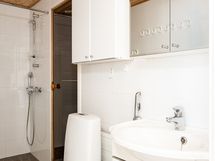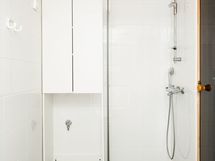 - Pesutilojen kuvaus: Tilava kylpyhuone on remontoitu taloyhtiön toimesta vuonna 2018. Kylpyhuoneen varustuksiin kuuluu wc-istuin, bideesuihku, lavuaari, allas- ja peilikaappi, suihku, suihkuseinä, pesukoneliitäntä ja tilavaraus pesutornille, sekä monipuoliset kaapistot. Kylpyhuoneen lattia ja seinät ovat laatoitetut. Kylpyhuoneen yhteydessä on myös huoneiston oma sauna. Erillisen WC:n kuvaus: Arjen askareita helpottaa oma, kylpyhuoneesta erillinen WC. Erillis-WC:n varustuksiin kuuluu wc-istuin, bideesuihku, lavuaari, allas- ja peilikaappi. Tilan seinät ovat maalattua lasikuitutapettia, välitila ja lattia laatoitettuja.