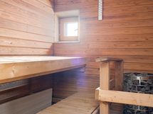 - Huoneistossa on oma sauna, joka lämpiää tyylikkäällä sähkötoimisella pilarikiukaalla. Saunassa on ikkuna ja lasiovi. Katto ja seinät ovat paneloidut, ja lattia laatoitettu.