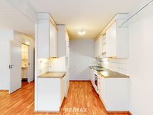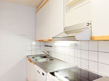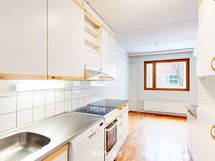 - Selkeälinjainen ja käytännöllinen keittiö, jossa on riittävästi kaappi- ja työskentelytilaa arjen tarpeisiin. Varusteluun kuuluu keraaminen liesi, liesituuletin, astianpesukone sekä jääkaappipakastin. Vaaleat pinnat ja puunsävyiset yksityiskohdat tekevät tilasta valoisan ja kodikkaan. Seinät ovat maalatut, välitilat laatoitetut, työtasot terästä ja laminaattia ja lattia parkettia.