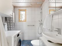 - Suihku, peilikaappi, allaskaappi, kiinteät valaisimet, pesukoneliitäntä, pyyhekuivain, säilytyskaappi pesukonepaikan yläpuolella.
