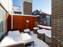 Kodin ulkotilat rytmittävät asumista kauniisti: suojaisa piha, parveke ja kattoterassi tarjoavat oman paikan joka tilanteeseen. Kokonaisuutta täydentävät oma sauna sekä harvinainen kahden auton autotalli.