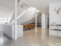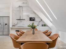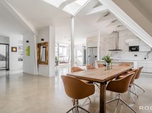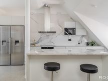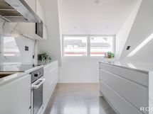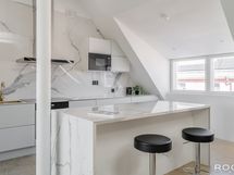 - Keittiön varusteet: Jääkaappi (Siemens), erillinen pakastin (Siemens), mikroaaltouuni (Miele, integroitu), astianpesukone (Miele, integroitu), liesituuletin (Hormi), uuni (Miele, integroitu) ja induktioliesi (miele), kiinteät valaisimet (led-nauha), saareke. Liesi: Induktioliesi. Työtason materiaali: Keraaminen suurlaatta (myös saarekkeessa).