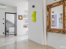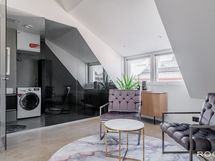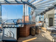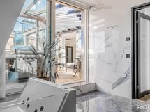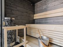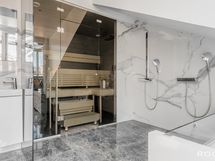 Kauppaan kuuluva varustus: poreamme, suihku (x2), wc-istuin, pesuallas, allaskaappi, bideesuihku, peili, sauna, sähköinen pimennysverho, kiinteät valaisimet. Pesuhuoneesta käynti suoraan terassille.