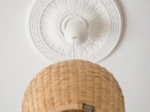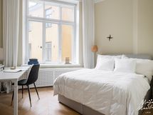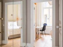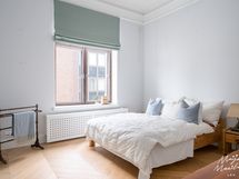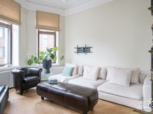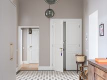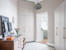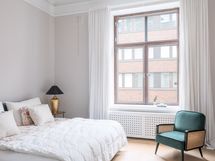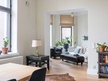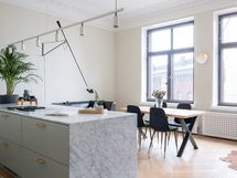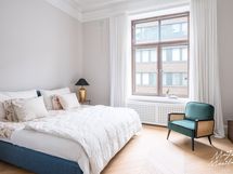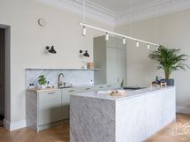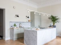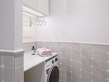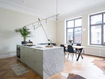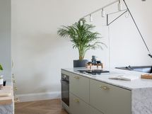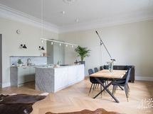 - Chevron-ladottu Timberwisen tammiparkettilattia, maalatut seinät. Induktioliesi integroidulla tuulettimella, yhdistelmäuuni (mikroaaltouunia ja uuni), astianpesukone, jääkaappi ja pakastin. Kitzenin keittiökaapistot. Keittiön välitila ja tasot marmoria.