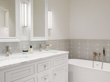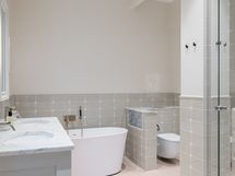 - Pesutilojen kuvaus: Laatoitettu lattia ja osittain laatoitetut/osittain maalatut seinät. Suihku, suihkulasiseinä, kylpyamme, allas x 2, allashana x 2, allaslaatikosto, peili ja seinäkiinnitteinen wc-istuin. Tasot marmoria. Lattialämmitys, pyyhepatteri. Erillisen WC:n kuvaus: Erillinen wc: