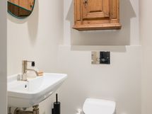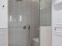 Laatoitetut lattiat ja seinät. Allas, allashana, peili ja seinäkiinnitteinen wc-istuin. Lattialämmitys. Antiikkikaapi seinällä.