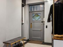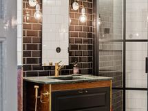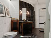 - KPH: lavuaari, allaslaatikosto, bidee-suihku, lattialämmitys, kaapistot, sadesuihku, suihku, suihkuseinät, wc-istuin, peili, kiinteät valaisimet, pyykinpeuskoneliitäntä, valaisimet WC: wc-istuin, bidee-suihku, allaslaatikosto, peili. Tasot vihreää marmoria, kaikki vesisekoittimet messinkiä (Tapwell)