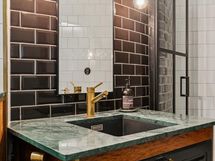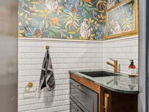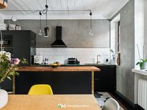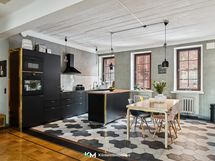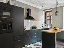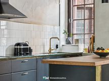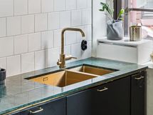 - Jääkaappi/pakastin (integroitu), mikroaaltouuni, astianpesukone (Miele, integroitu), induktioliesi, kiertoilmauuni, messinkihana (Tapwell), messinkiallas (Tapwell) vihreät marmoritasot (saarekkeessa puuviilu).
