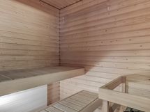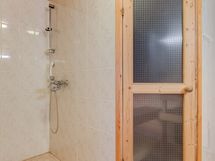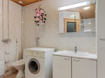 - Reilunkokoinen kylpyhuone, jossa suihku omassa tilavassa syvennyksessään. Pesukone, Peilikaappi, Allaskaappi, Wc-istuin, Säilytyskaappi, Bidee-suihku. Kylpyhuoneen yhteydessä sauna.