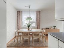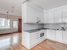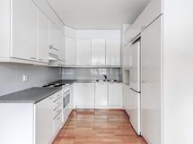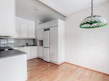 - Ruokailutilaan ja olohuoneeseen yhdistyvä keittiö, jossa astianpesukone, jääkaappi-pakastin, liesi, liesikupu, tilavaraus mikroaaltouunille sekä runsaasti kaappi- ja laskutilaa. Laadukas A la Carte -keittiö on kestänyt käyttöä hyvin.