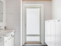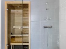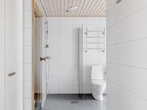 - Erillisessä WC:ssä Peilikaappi, allaskaapisto. Kylpyhuoneessa: suihku, sauna, pyyhekuivain, peilikaappi, lattialämmitys, käynti lasitetulle parvekkeelle, pyykinpesukoneliitäntä, paikka kuivausrummulle, kylpyhuonekaapisto