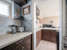 Keittiö on remontoitu ja laajennettu nykyiseen asuunsa vuonna 2014. Remontin ansiosta keittiössä on runsaasti säilytys- ja laskutilaa.