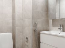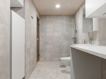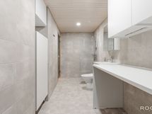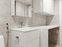 - Pesutilojen kuvaus: Laattalattia. Seinät kaakelia. Katto paneloitu (valkokuullotettua kuusta). Varustus: Peilikaappi, allaslaatikosto integroiduilla vetimillä, matala pyykkikaappi (valkoinen), säilytyskapit (valkoinen), suihkuseinä, suihku, wc-istuin. Erillisen WC:n kuvaus: Laattalattia. Seinät kaakelia. Katto paneloitu. Varustus: Peilikaappi, allaslaatikosto, wc-istuin.