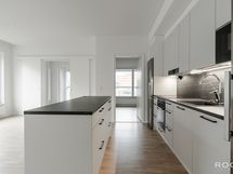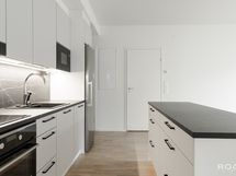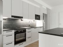 - Tamiparkettilattia (vaalea, mattalakattu). Seinät maalattu. Työtaso laminaattia (musta). Varustus: Musta keittiöallas, keittiöhana,