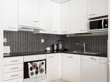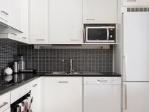- Työtaso: laminaattitaso, metalli/rosteritaso. Avokeittiö + Jääkaappipakastin + Keraaminen liesi + Erillisuuni + Liesituuletin suodattimella + Astianpesukone