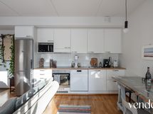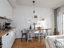 - Keittiön varusteet: Jääkaappi, erillinen pakastin, liesi, liesituuletin, uuni ja astianpesukone. Liesi: Keraaminen liesi. Työtason materiaali: Laminaatti.