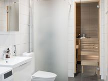 - Pesutilojen kuvaus: Saunallinen kylpyhuone, jossa tilaa pesutornille. Varustus: suihku, suihkuseinä, wc, sauna, pesuallas, peili- ja allaskaappi, pesukoneliitäntä sekä lattialämmitys.