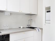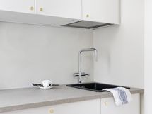 - Keittiön varusteet: Jääkaappi, astianpesukone, uuni ja liesi (Induktio). Työtason materiaali: Laminaatti.