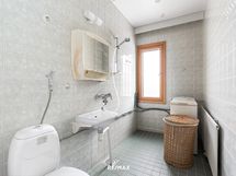 - Pesutilojen varusteet: WC-istuin, suihku, pesukoneliitäntä ja pesuallas. Pesutilojen kuvaus: Pitkän mallinen, ikkunallinen kylpyhuone, iso kuivasupatteri.