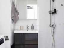 - Pesutilojen kuvaus: suihku, peilikaappi, allaskaappi, pesukoneliitäntä, .