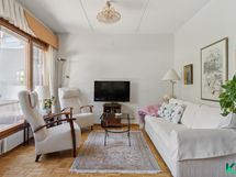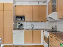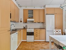 - Kaapistot, jääkaappi/pakastin, hella keraamisella tasolla, liesituuletin hormiin, astianpesukone, kiinteät valaisimet. Lattia: Mosaiikkiparketti. Seinät: Maalattu, laatta välitilassa
