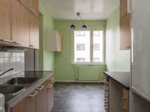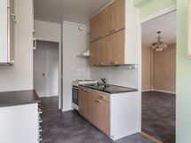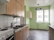 - Kaapistot, välitilassa laatoitus+valaisimet/pistorasiat, teräksinen tiskipöytätaso, liesi (vapaasti seisova), liesituuletin (suodattimella), jääkaappi.