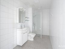 Pesutilojen varusteet: WC-istuin, suihku, suihkuseinä, pesukoneliitäntä, peili ja lattialämmitys.