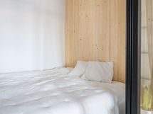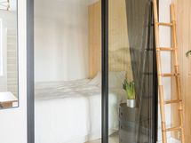 Lasiseinällä erotettu makuualkovi tuo kokonaisuuteen oman rauhallisen osansa säilyttäen samalla tilan avoimuuden. Ratkaisu toimii luontevasti osana asuntoa: oma paikka levätä, mutta ilman että tilan avaruus katoaa.
