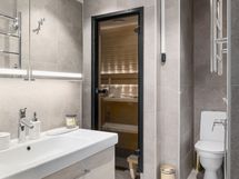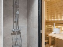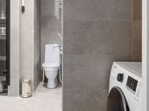 Kylpyhuone on uusittu perinteisen linjasaneerauksen yhteydessä. Tilaa on pesutornille, ja oman saunan löylyissä arki rauhoittuu päivän päätteeksi. Taloyhtiöllä on lisäksi pesutupa.