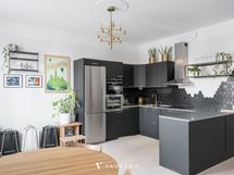 Keittiö on toteutettu tummasävyisenä ja selkeälinjaisena. Mielen laadukkaat kodinkoneet ja Liebherr viinikaappi täydentävät kokonaisuuden.