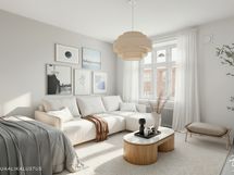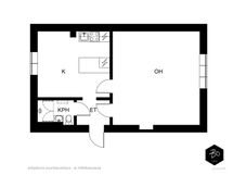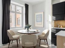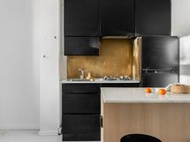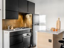 - Lattia: Betoluxilla maalattu mäntylattia. Seinät: maalattu. Välitila: messinkiä. Työtasot: marmoria. Keittiön valmistaja: KVIK (tammikaapit). Kauppaan kuuluva varustus: jenkkikaappi, uuni, kaasuliesi, astianpesukone, keittiön mustat baarijakkarat 2 kpl.