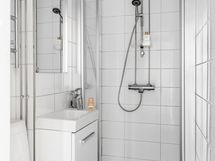 - Pesutilojen kuvaus: Lattia: laatta. Seinät: laatta. Kauppaan kuuluva varustus: wc-istuin, bideesuihku, suihku, suihkuovet, peilikaappi, allaskaappi, kiinteät spottivalot, rättipatteri, lattialämmitys (sähkö).