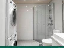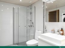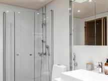 - Kylpyhuoneessa suihku, kääntyvät suihkuseinät, peilikaappi valolla, allaslaatikosto, kylpyhuonekaapisto, paikka pesutornille, kiinteät valaisimet, sauna ja lattialämmitys
