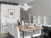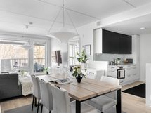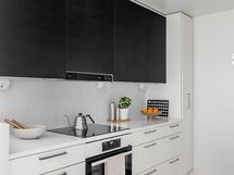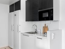 - Puustellin mustavalkoinen keittiö, jossa induktioliesi, erillisuuni, mikroaaltouuni, iso jääkaappi ja pakastin, astianpesukone, ja liesituuletin
