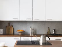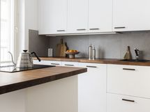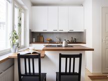 Vuonna 2024 täysin remontoitu keittiö on ilo kotikokille ja leipojalle. Työskentelytilaa on runsaasti, kokonaisuus on toimiva ja ajaton, ja laadukkaat kodinkoneet – kuten induktioliesitaso integroidulla liesituulettimella – viimeistelevät kokonaisuuden.