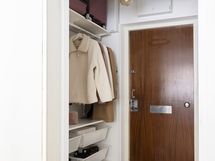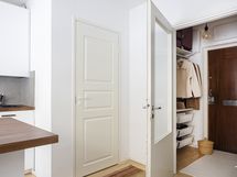 Säilytysmahdollisuudet ovat yksi asunnon ehdottomista vahvuuksista: erillinen, tilava vaatehuone sekä eteisen fiksu säilytysratkaisu, joka tarjoaa paikan päällysvaatteille, kengille ja jopa matkalaukuille – harvinaista tässä kokoluokassa.