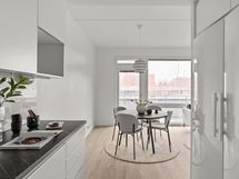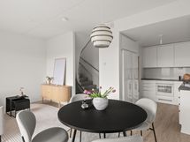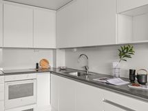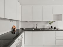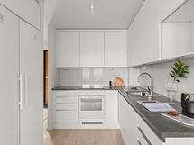 - Keittiön varusteet: Jääkaappi, erillinen pakastin, uuni, liesi, liesituuletin ja astianpesukone. Liesi: Induktioliesi. Työtason materiaali: Laminaatti. Kodinkoneet valkoisia, astianpesukone kalustepeitteinen.
