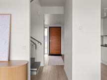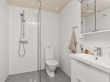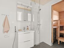 - Pesutilojen varusteet: Allaskaappi, peilikaappi, suihkuseinä, wc-istuin, suihku, pesukoneliitäntä, lattialämmitys, bidee-suihku ja pesuallas. Erillisten WC:n lukumäärä: 1. Erillisen WC:n varusteet: WC-istuin, suihku, suihkuseinä, lattialämmitys, peilikaappi, pesuallas, allaskaappi, bidee-suihku ja lattiakaivo. Erillisen WC:n kuvaus: Toinen kylypyhuone.