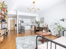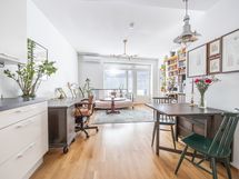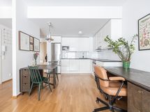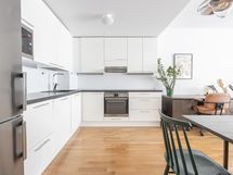 - Avokeittiön lattia on parkettia ja seinät on maalattu. Liesi, liesituuletin, astianpesukone, jääkaappi/pakastin, integroitu mikroaaltouuni, kaapistot