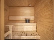- Kuvaus: Saunan lattia on laatoitettu ja seinät paneloitu. sähkökiuas