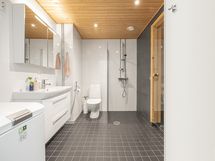 Suihku, suihkuseinä, allas, allaskaappi, peilikaappi, pesukoneliitäntä.